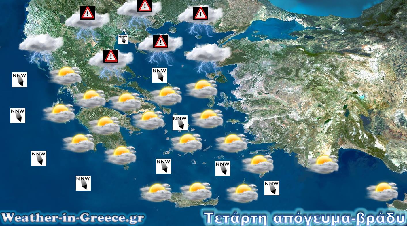 Συγκεκριμένα την Τετάρτη τις απογευματινές-βραδινές ώρες καταιγίδες θα εκδηλωθούν στους νομούς Θεσσαλονίκης-Δράμας-Σερρών-Καβάλας-μέχρι και την Ροδόπη. Καταιγίδες θα εκδηλωθούν στην Ήπειρο (και στα νησιά του βόρειου Ιονίου)αλλά και στην βορειοανατολική Θεσσαλία μέχρι την Πέλλα-Πιερία-Ημαθία . Μέχρι το βράδυ οι καταιγίδες θα επεκταθούν στην Χαλκιδική και στα νησιά του βορειοανατολικού Αιγαίου από την Λέσβο μέχρι την Θάσο και την Λήμνο-Σαμοθράκη.