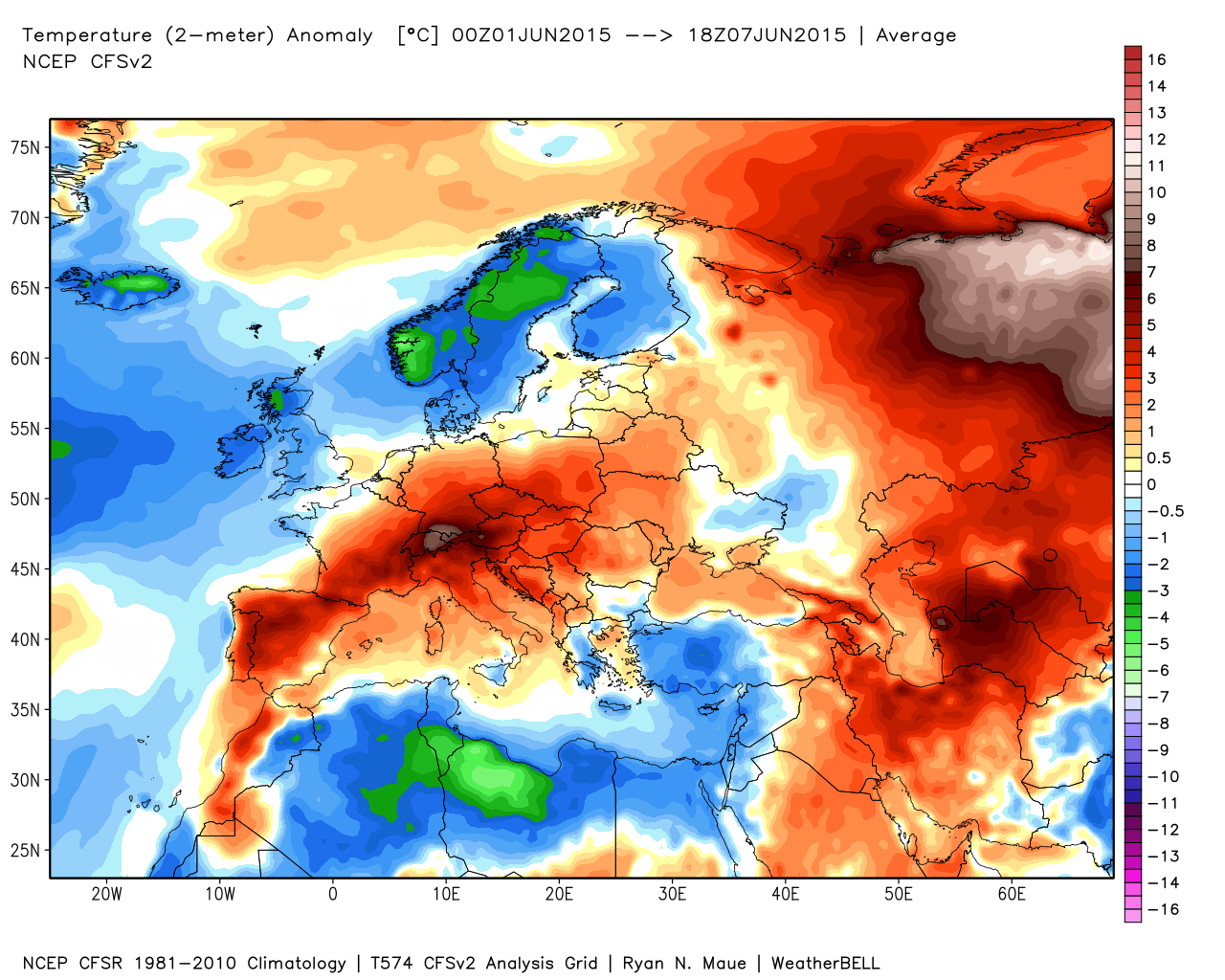 Δείτε τον κλιματικό χάρτη της Ευρώπης για τις πρώτες μέρες του Ιουνίου όπου η Ελλάδα οι ακτές της Αφρικής και η Τουρκία μαζί με την νότια Ιταλία είναι κατά 2-3 βαθμούς ψυχρότερες θερμοκρασιακά βάση των θερμοκρασιών της εποχής. Αντίθετα η κεντρική και δυτική βορειοδυτική Ευρώπη έχει υψηλές θερμοκρασίες για την εποχή κατά 3-4 και τοπικά 5-6 βαθμούς πάνω από τα κλιματικά επίπεδα.